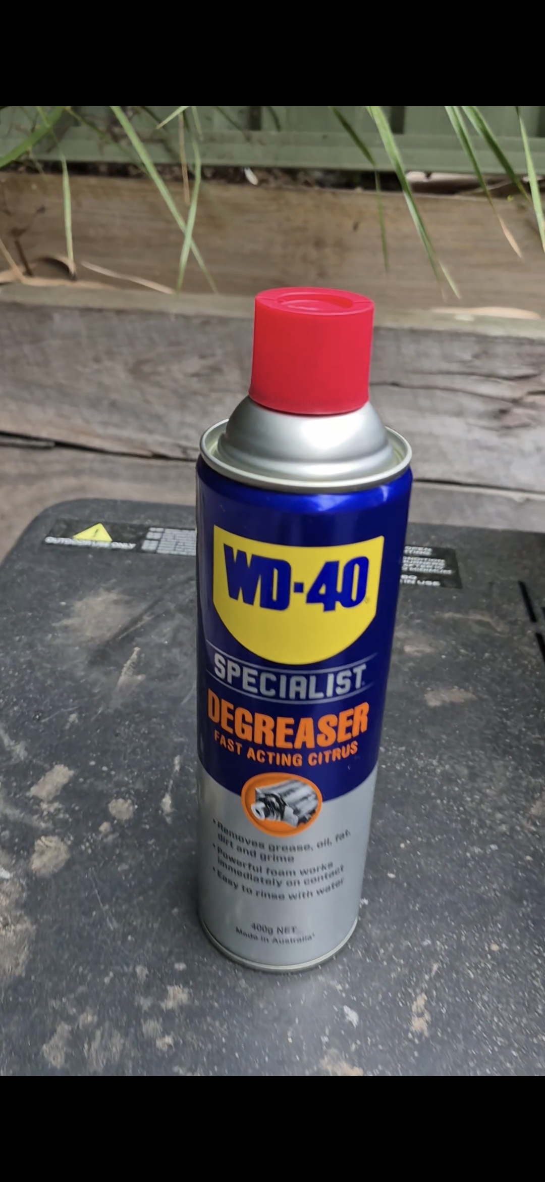 I applied WD-40 Specialist Degreaser to the outside of the BBQ to cut through the grease and dirt. After letting it sit briefly, I wiped the surface clean to remove the built-up grime.
